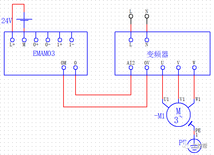 PLC 200 smart可以扩展六个模块,通过扩展模块接口和PLC连接在一起,不需要额外接线,PLC模拟量模块我们选择EMAM03,该模块为两路模拟量输入和一路模拟量输出模块,EMAM03模块和变频器之间的连接如下图所示。